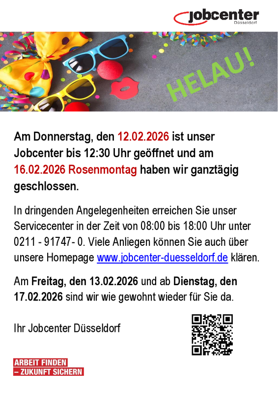Am Donnerstag, den 12.02.2026 ist unser Jobcenter bis 12:30 Uhr geöffnet