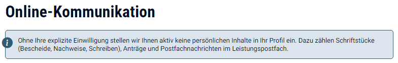 Seit November 2024 können Sie uns nur noch Nachrichten schreiben, wenn Sie der Online-Kommunikation zugestimmt haben. Das bedeutet: Sie sind damit einverstanden, dass Sie online mit uns kommunizieren und Bescheide nur noch digital von uns erhalten wollen. Bitte beachten Sie: Kundinnen und Kunden, die eine Vertretung (gesetzliche Betreuer, erziehungsberechtige Personen bei Minderjährigen, bevollmächtigte Personen) hinterlegt haben, können die Online-Kommunikation nicht aktivieren. Der Postfachservice steht somit nicht zur Verfügung.