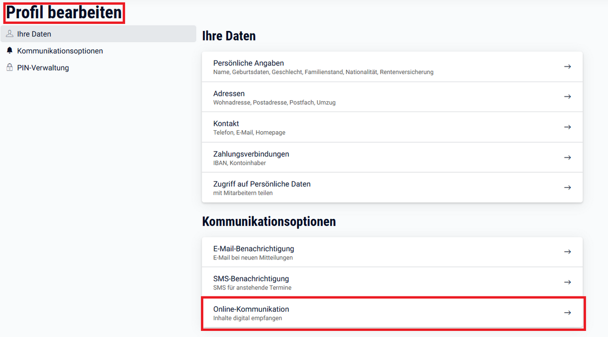 Bitte beachten Sie, dass Sie Bankverbindungen im Online-Bereich seit April 2025 nur noch mittels BundID mit den Optionen “eID” bzw. “Elsterzertifikat” (Vertrauensniveau “Substanziell”) ändern können.