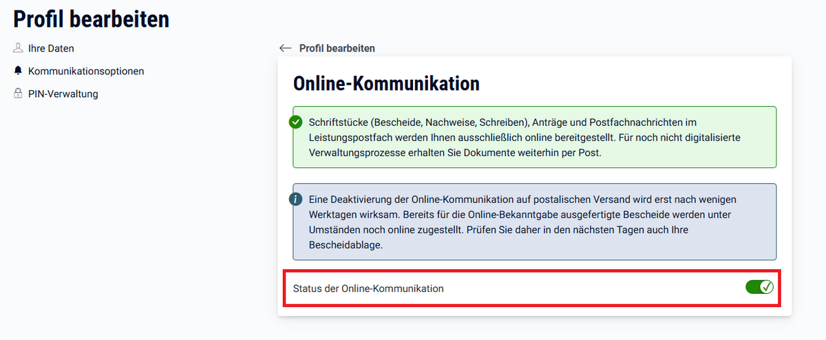 Aktivieren Sie die Online-Kommunikation in Ihrem Profil unter “Profil bearbeiten” > “Kommunikationsoptionen” > “Online-Kommunikation”. Klicken Sie unten rechts den Schieber/Regler auf grün. Beachten Sie, dass Sie nach Zustimmung zur Online-Kommunikation Bescheide und Schreiben digital über jobcenter.digital erhalten.